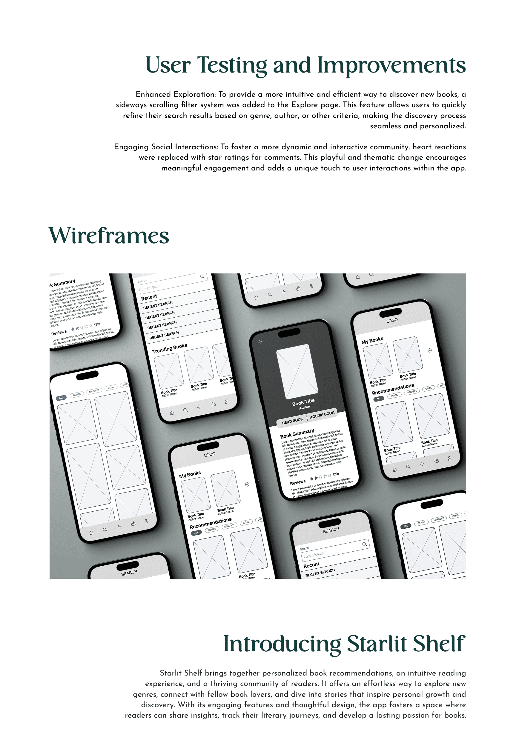 Starlit Shelf is a conceptual reading platform designed through a full UX process, from research to wireframing and prototyping. The experience is built around seamless discovery, organization, and engagement, allowing users to explore books through a visual, scrollable feed and save them to curated collections. A streamlined reading interface includes annotation tools, reviews, and discussion features, creating a more interactive and social experience. Every design choice focuses on personalization and ease of use, making book discovery and reading feel effortless and inspiring.