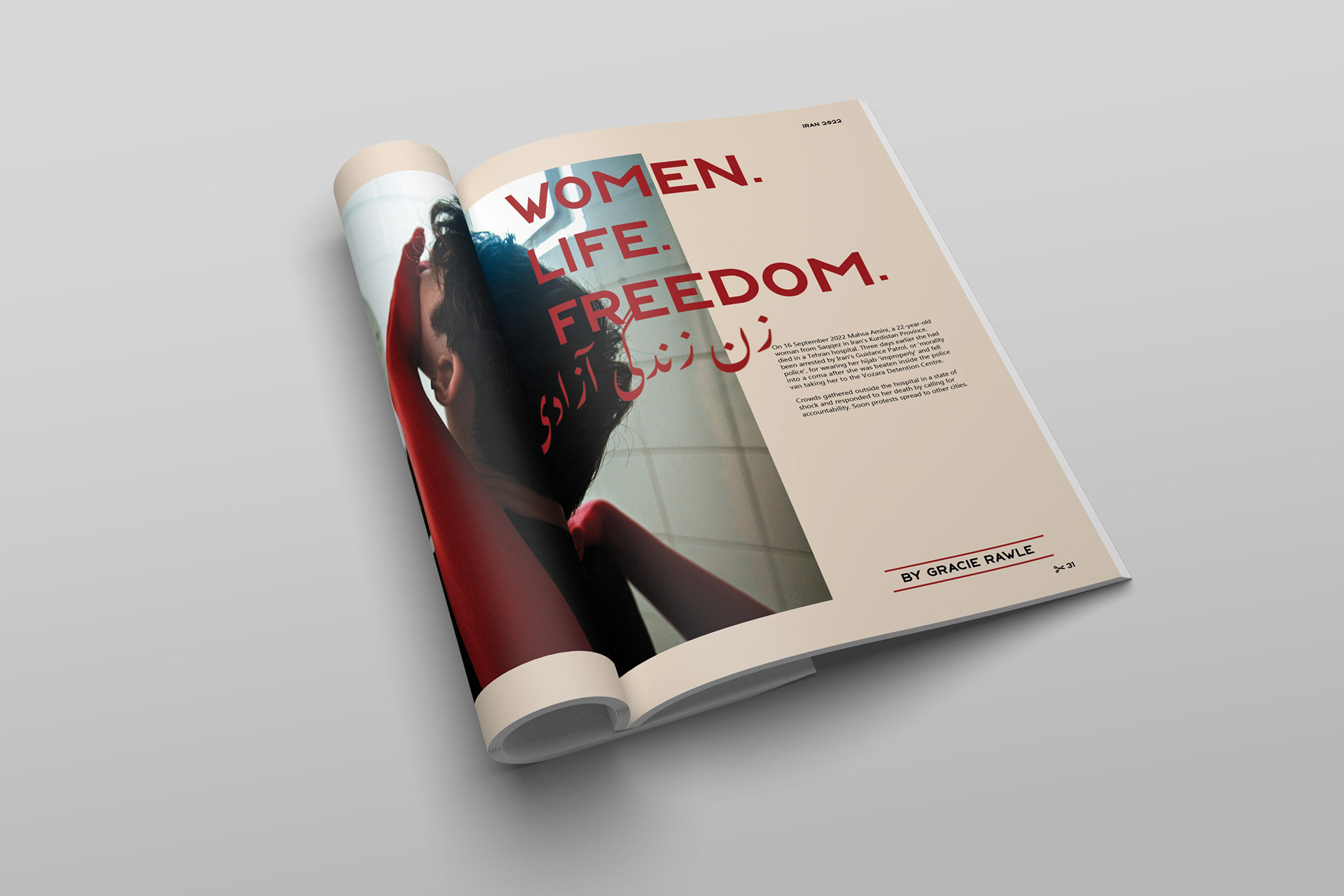 This editorial design highlights the Iranian protests for women’s rights, sparked by the brutal murder of Mahsa Amini in 2022. The 22-year-old woman was killed by the morality police for not wearing her hijab correctly. In Iran, women are legally required to wear hijabs, representing a broader oppression of their rights. The design uses raw imagery, intense colors, and bold typography to convey the urgency and gravity of this rebellion against tyranny, amplifying the voices calling for freedom and justice.